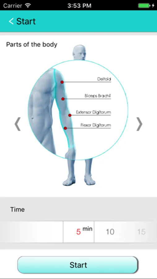 4. Start training: choose training part and training duration before the training, and the parameters can be adjusted during your training. It records your training when it ends. User can customize the training plan according to your own needs.
