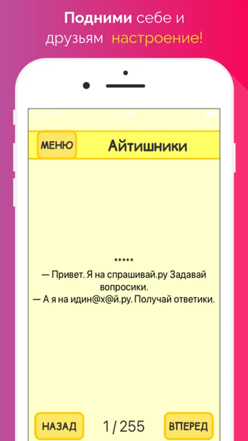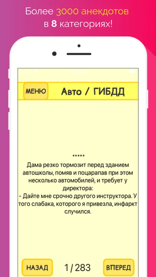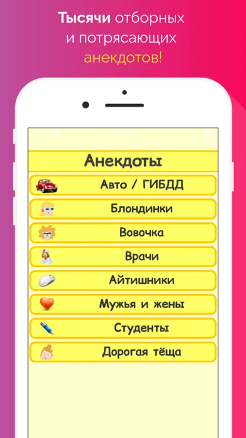 Тысячи отборных и потрясающих шуток, которые украсят ваш день! Ждете автобус? Стоите в очереди? Нечем заняться? Просто используйте это приложение, чтобы поднять себе настроение и заставить друзей смеяться. Программа работает без Интернета. На данный момент Программа содержит более 3000 анекдотов, которые размещены в 8 категориях.