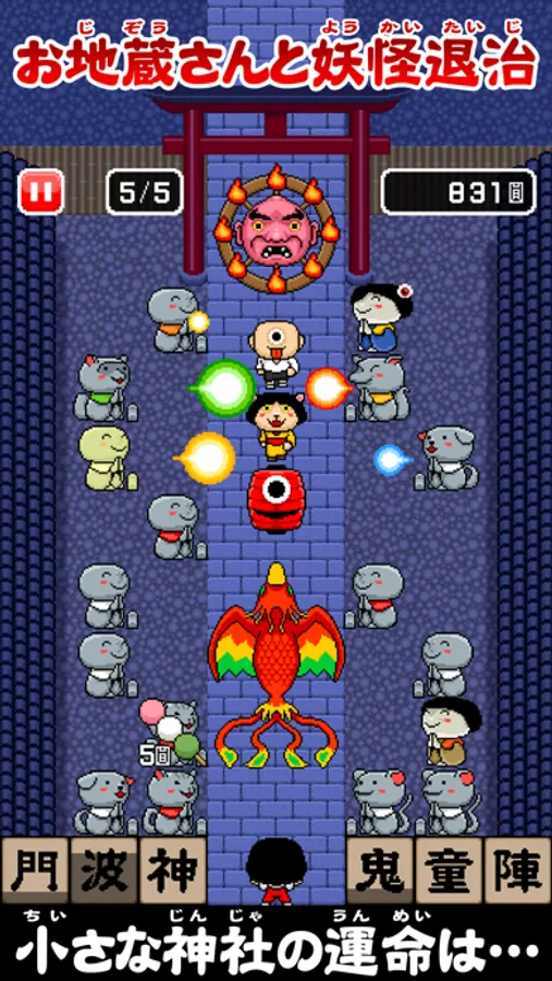 襲ってくる妖怪を退治する神社経営と神社防衛(タワーディフェンス)が融合したゲームです。