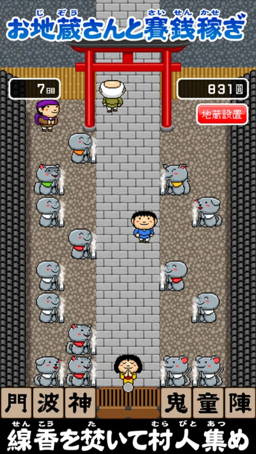 賽銭箱をタップしてお金を回収し、お地蔵さんの設置や四神召喚や魔方陣などの強化を行います。