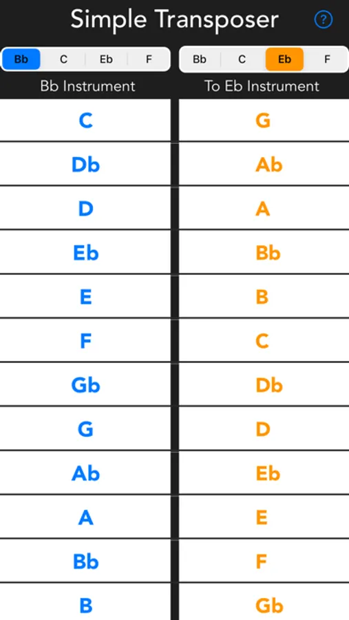 Simple Transposer is a musical utility allowing quick transposition between C, Bb & Eb instruments.