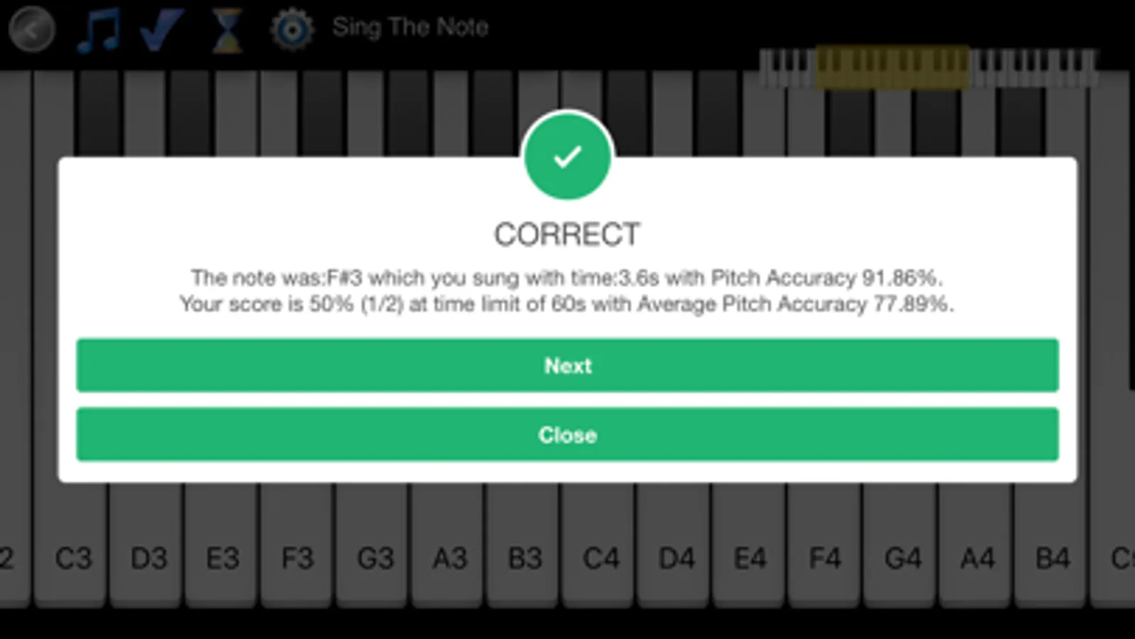 • The piano keys highlight showing which note you should sing and which pitch you are correctly singing.