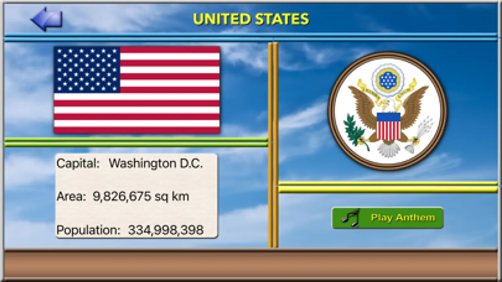 “Terra Flags” provides flags, emblems, national anthems (music) and some basic info (capital city, area and population) of world countries.