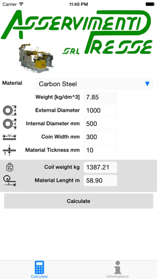 Filling in the worked material data such as: material type, width, thickness external and internal coil diameter, the program will provide you the coil weight (Kg) and the coil length (m)