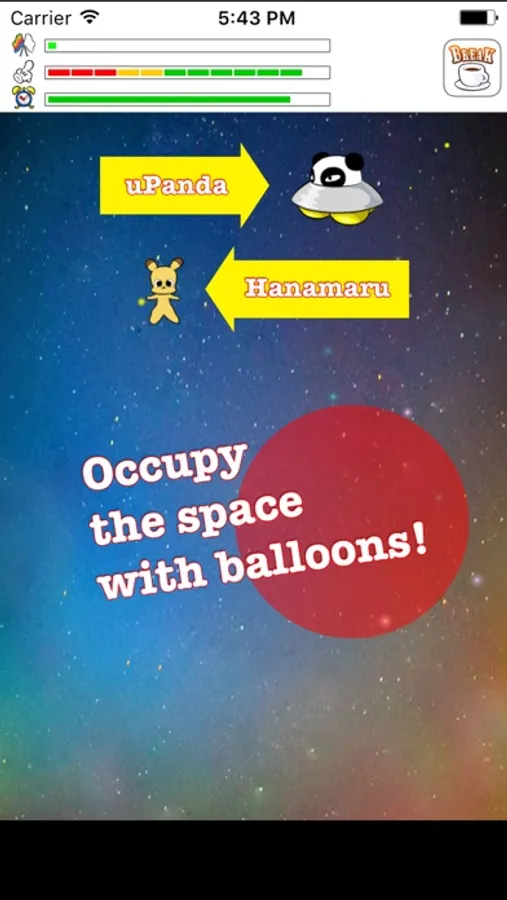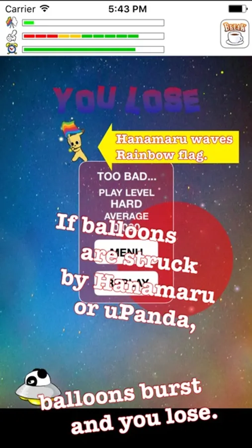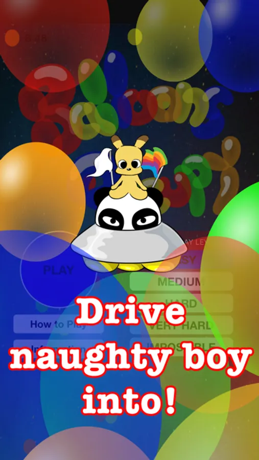If the difficulty level becomes to MEDIUM mode and more, uPanda, a member of the family, aboard the UFO appears as a bother character. If inflating balloon touches to him, it bursts and you lose. Movement of uPanda UFO becomes to complicate as difficulty level increases.