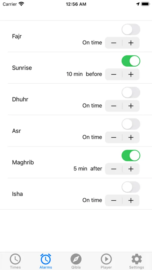 * Choose from 14 built-in full Azan alarms, or choose a song from your iTunes Music Library.