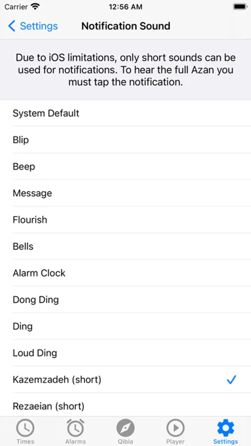 * Choose from 24 different notification sounds including the default iOS notification sound, 9 discrete iOS-like sounds as well as 14 short clips of Azan.
