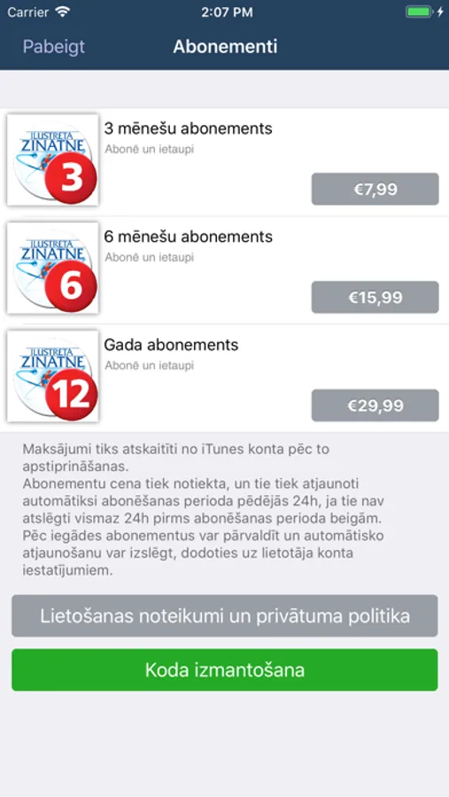 * Maksājumi tiks atskaitīti no iTunes konta pēc to apstiprināšanas. Abonementu cena tiek notiekta, un tie tiek atjaunoti automātiksi abonēšanas perioda pēdējās 24h, ja tie nav atslēgti vismaz 24h pirms abonēšanas perioda beigām. Pēc iegādes abonementus var pārvaldīt un automātisko atjaunošanu var izslēgt, dodoties uz lietotāja konta iestatījumiem.