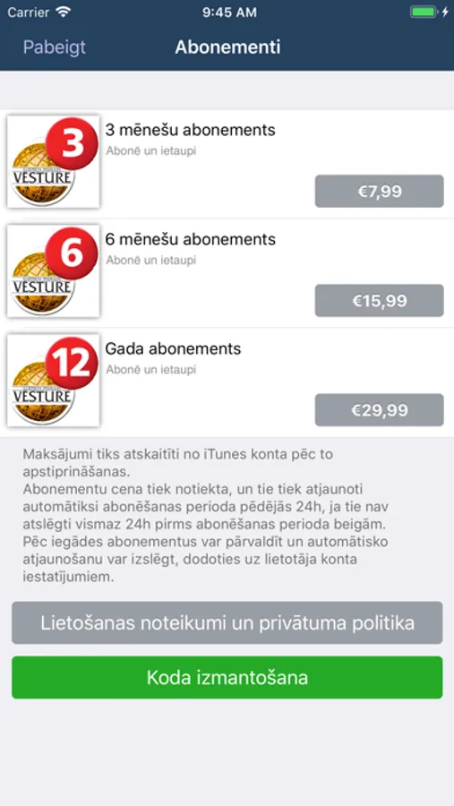 * Maksājumi tiks atskaitīti no iTunes konta pēc to apstiprināšanas. Abonementu cena tiek notiekta, un tie tiek atjaunoti automātiksi abonēšanas perioda pēdējās 24h, ja tie nav atslēgti vismaz 24h pirms abonēšanas perioda beigām. Pēc iegādes abonementus var pārvaldīt un automātisko atjaunošanu var izslēgt, dodoties uz lietotāja konta iestatījumiem.