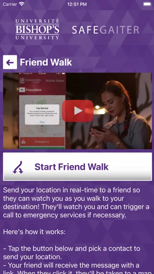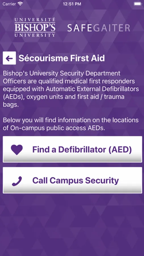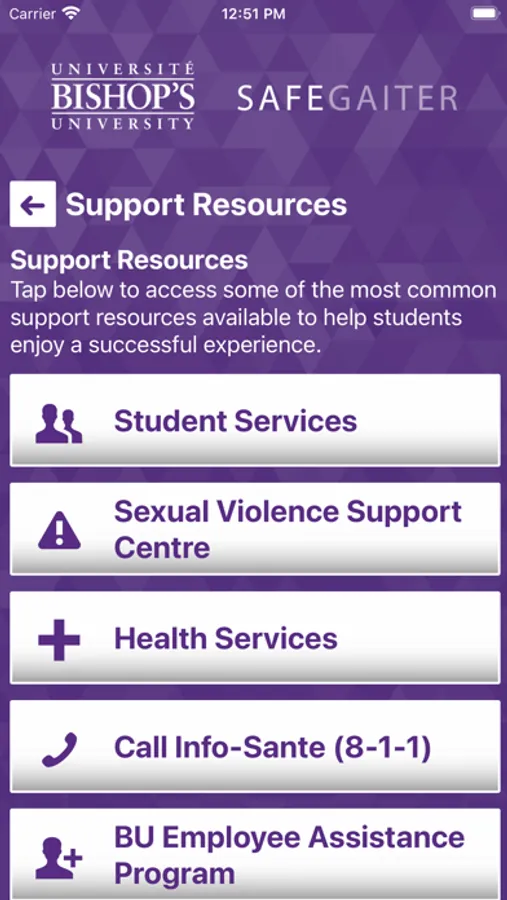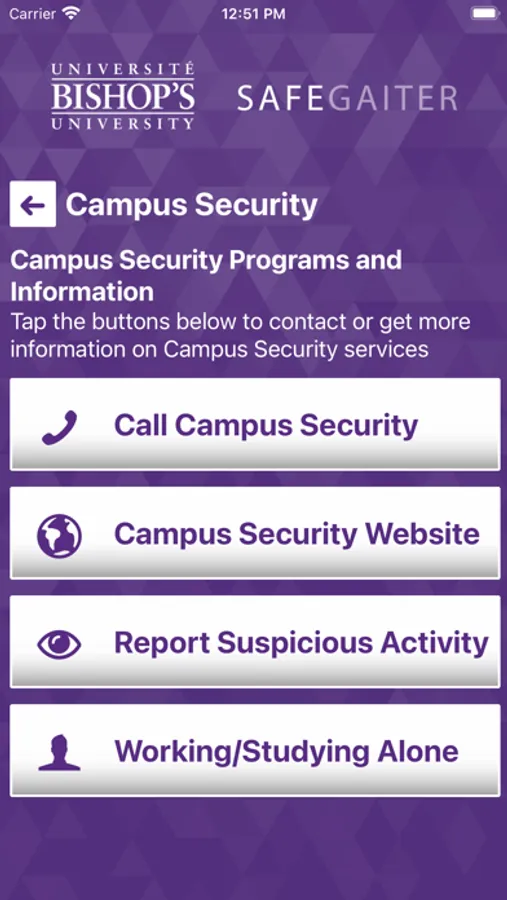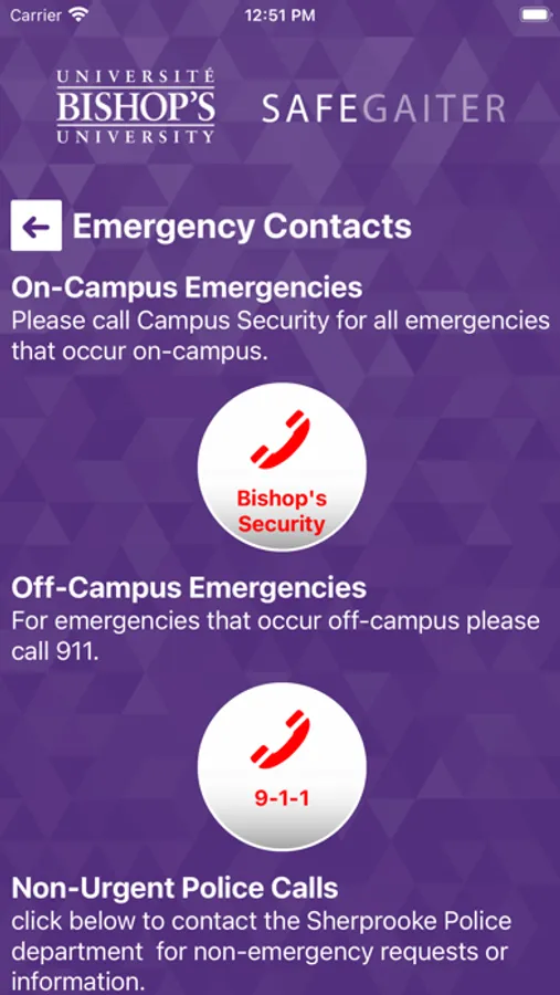 SAFEGaiter is a mobile safety app developed for our students, staff, faculty & visitors at Bishop's University. The app provides fast & easy access to campus security services, emergency guidelines & alerts, campus maps, personal support resources, safety tips, tools & more! This app was developed with direction from Bishop's University’s Human Resources and Security departments.