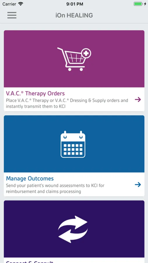 The iOn HEALING™ Mobile App from KCI USA, Inc. (KCI), now a part of 3M, is free for use by healthcare professionals in the U.S. The app offers a suite of tools designed to improve customer support, streamline business processes, and facilitate more efficient and effective communication between healthcare professionals and V.A.C.® Therapy representatives. The iOn HEALING™ App serves to facilitate a healthcare provider’s relationship with KCI by providing the following main functions: