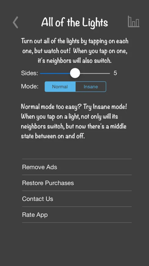 Once you've mastered the game, try Insane mode. When you tap on a light, not only will its neighbors switch, but now there's a middle state between on and off. Insane puts your skills to the test with a different yet familiar set up. Can you conquer this too?