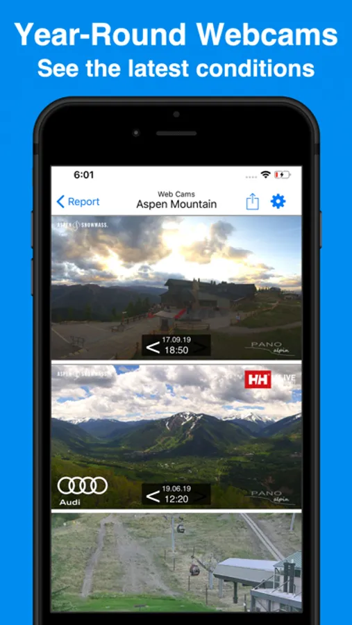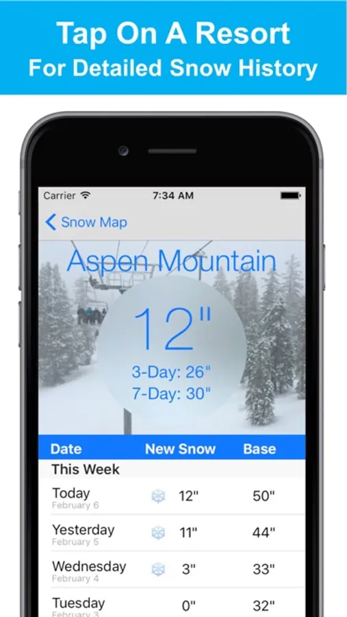 - Review detailed snow history for each resort by clicking on the resort to view the resort-specific page within the app, letting you see many days of snowfall history.