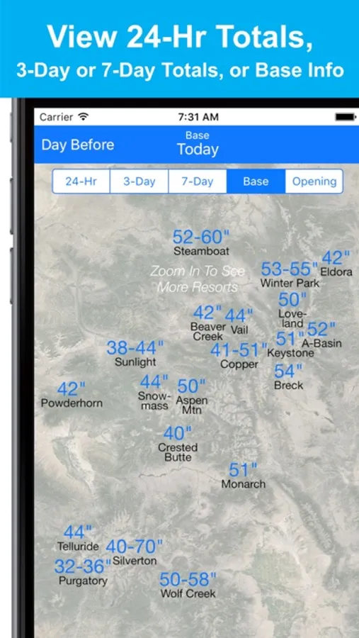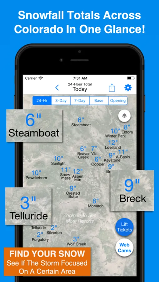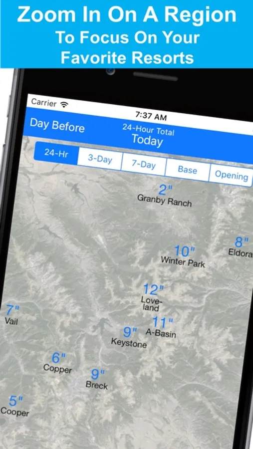 - Zoom in to your favorite part of Colorado to focus on the resorts you care most about. When you reopen the app, the Snow Map will take you right back to the region you were last viewing.