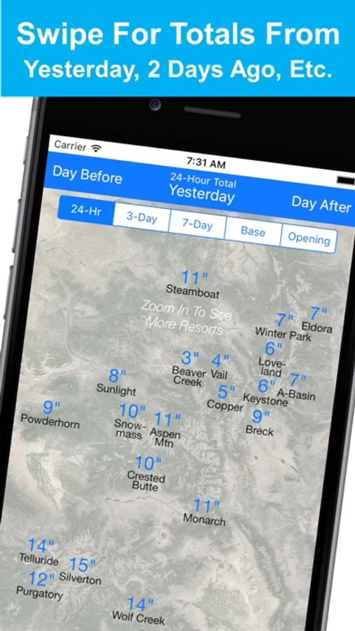 - See the same statistics for past dates by swiping left or right on the map. This lets you see how much snow each resort received yesterday, two days ago, etc.