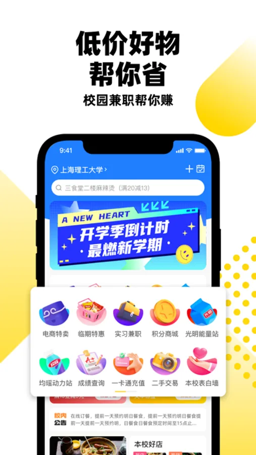 “俺来也-掌上超市”:线上下单,不出门不排队,无论是休闲零食、饮料乳品还是生活用品,校园超市的丰富商品,贴心服务的“筋斗云”同学为你送货到寝。