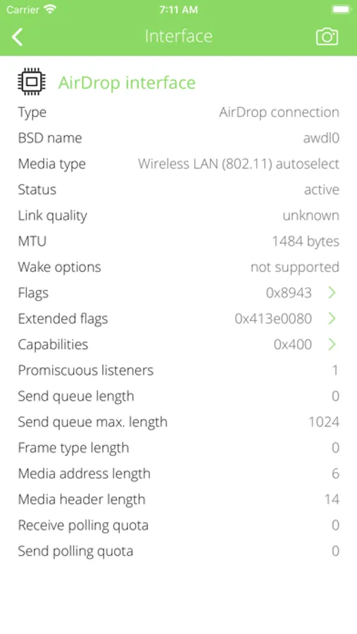 • Low-level informations about the AirDrop interface, technical parameters, flags.