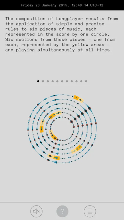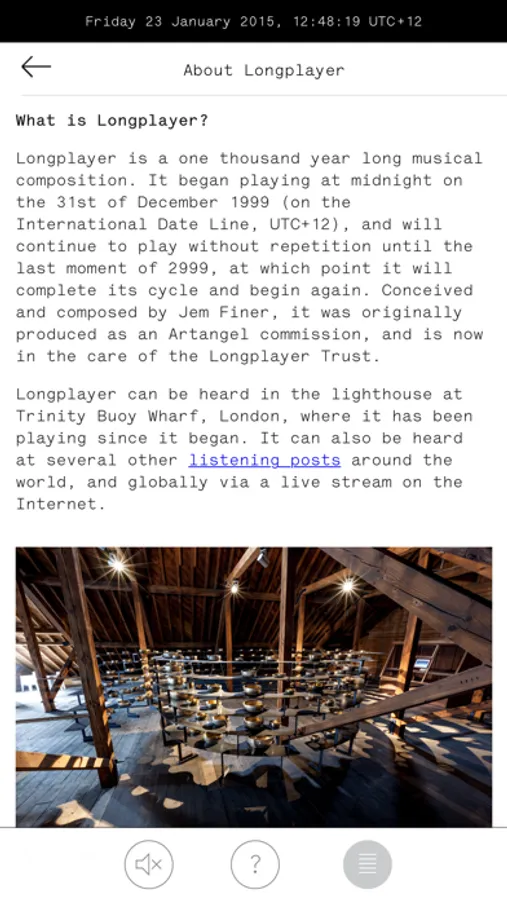 This app is the first standalone version of Longplayer, creating the music in real time based on the composition's thousand-year-long score. It requires no data connection and automatically synchronises itself with every other copy of the app across the globe. With this app, you become part of a community of listeners distributed through space and time, across many lifetimes.