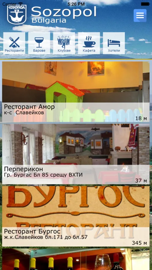 Burgas App mobile application will give you information about bars, cafes, restaurants, clubs and hotel. You will find also venues in the resorts close to Burgas, such as Nessebar, Sozopol, Pomorie, Chernomorets and others.