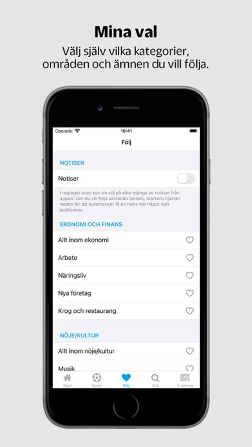 Med funktionen "följ" kan du enkelt bli notifierad vid händelser som intresserar dig. Välj själv vilka kategorier, områden och ämnen du vill följa genom att klicka på hjärtan. Du kan när som helst ändra dina inställningar.