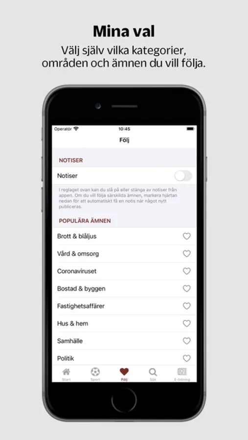 Med funktionen "följ" kan du enkelt bli notifierad vid händelser som intresserar dig. Välj själv vilka kategorier, områden och ämnen du vill följa genom att klicka på hjärtan. Du kan när som helst ändra dina inställningar.