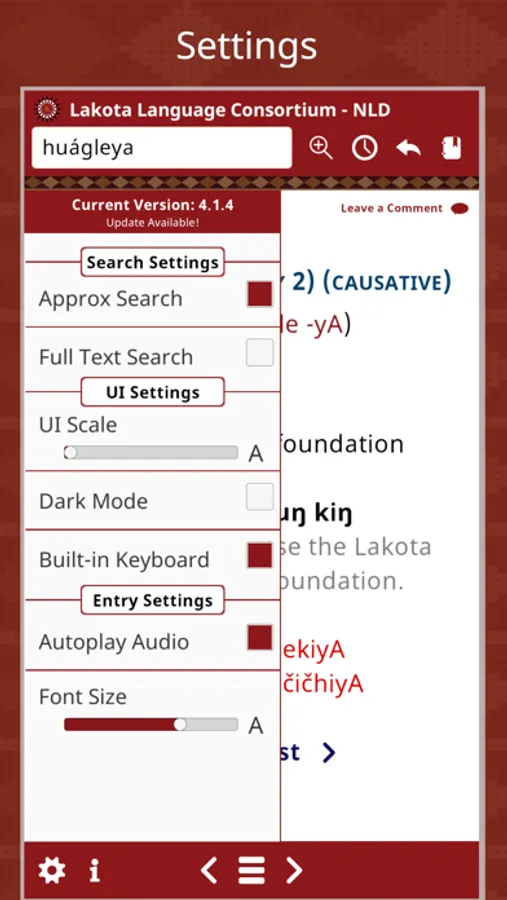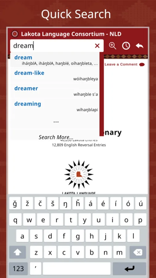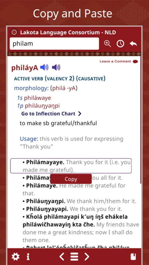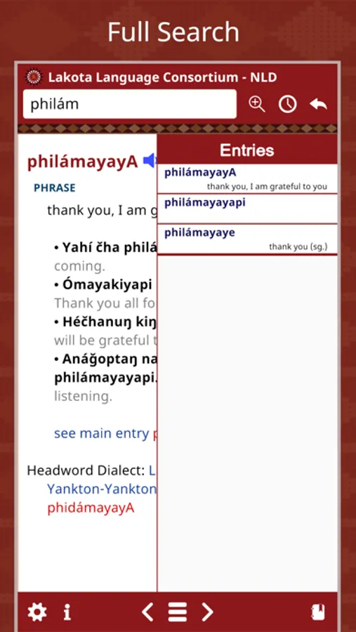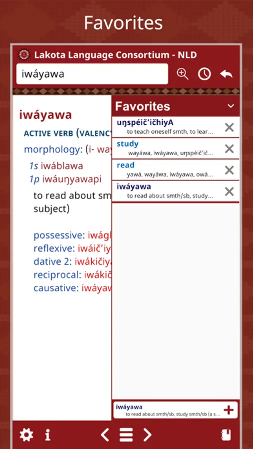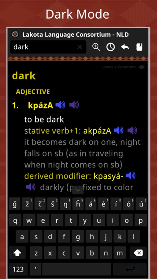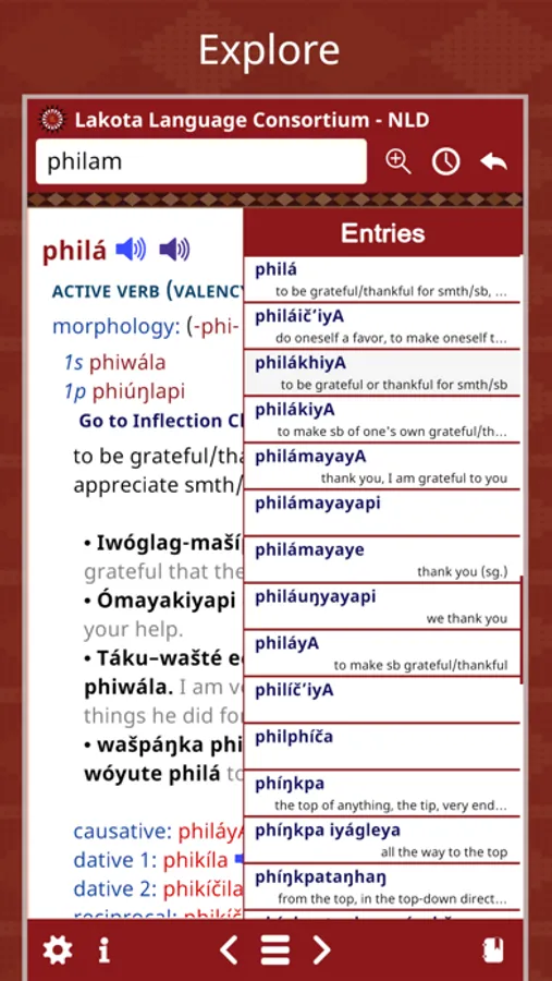 The lemmatizer is one of the biggest advantages of the app when compared to the printed version of the NLD. Affixes are added to words all the time, so identifying stems with multiple affixes can be challenging in a print dictionary, but this dictionary app does that for you. If you type in e.g. waŋwíčhablake the app will show you the entry waŋyáŋkA.