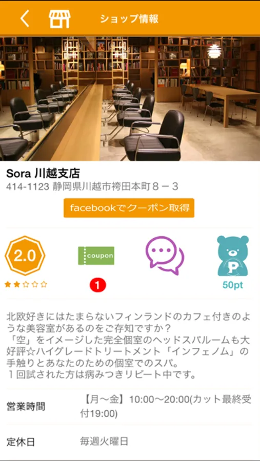 - お店の情報が充実しているので、営業時間、定休日、電話番号もいつでも確認。お店のFacebookもその場でチェックすることも。※Facebookは、Facebook Japanの商標または登録商標です。