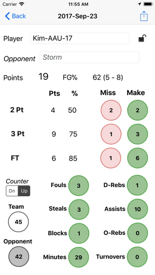All captured stats for a game are visible on the game screen. Stats are recorded by pressing the relevant button on the screen. Each button touch increments the associated stats count. What happens if you hit the wrong button? How can the incorrect update be corrected? Simple, locate the Counter control on the screen and switch it to "Dn" (or down). Afterwards, all button touches will decrement the associated stat. Once you're done, simply select "Up" (or up) on the Counter control.