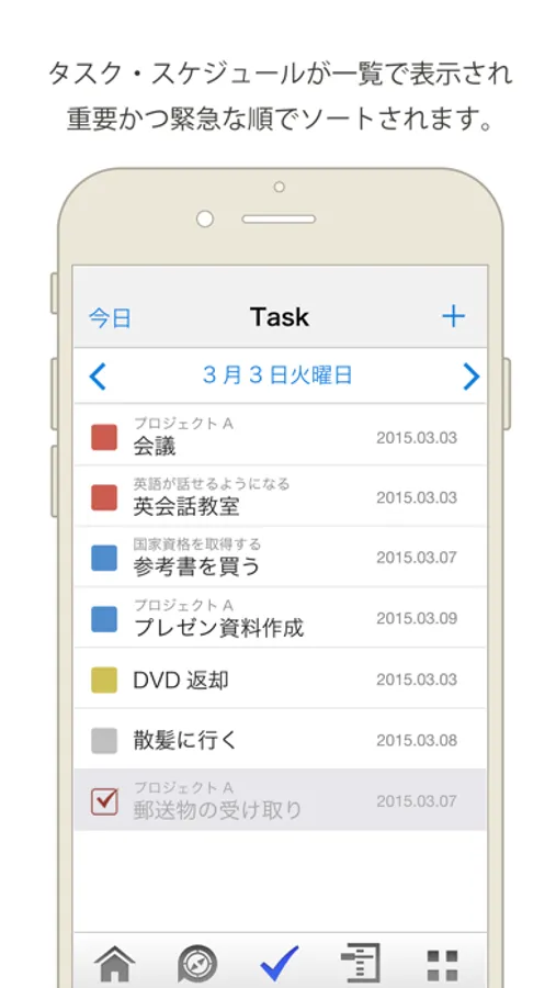 日々のタスクやスケジュールが一つにまとまり、ToDoリストとして表示されます。重要かつ緊急な順にソートされていますので、上から順番にチェックすれば、あたなのPurposeにより早く合理的に到達します。GTD(Getting Things Done)のような生産性を上げるアルゴリズムとなっています。
