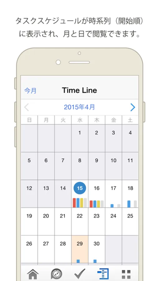 入力されたタスクスケジュールが時系列(開始順)で表示され、月と日で閲覧できます。どこにどのような予定がどのくらいあるか、またどこが空いているのかが一目でわかるようになっています。