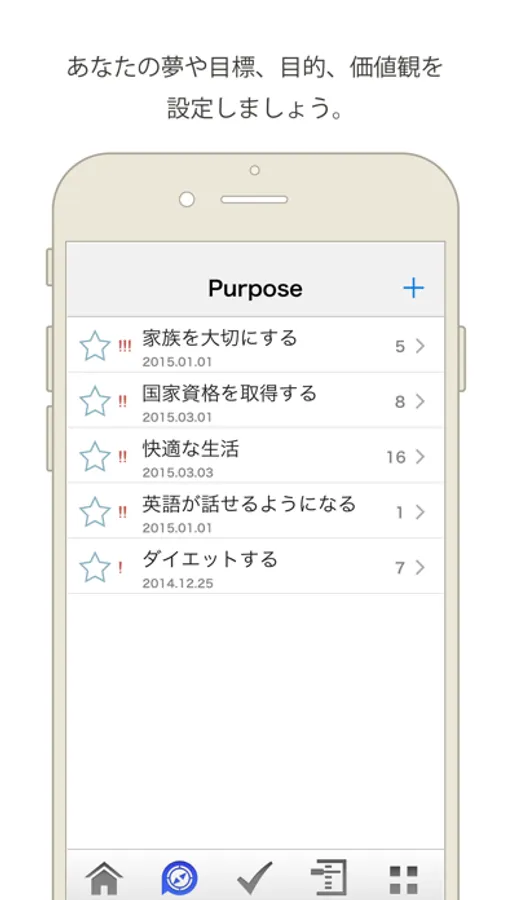 あなたの夢や目標・目的、価値観や願望を設定しましょう。Pastlyzeを上手に使うには、上手なPurposeの設定が重要となります。自身の人生設計において基盤となる部分です。