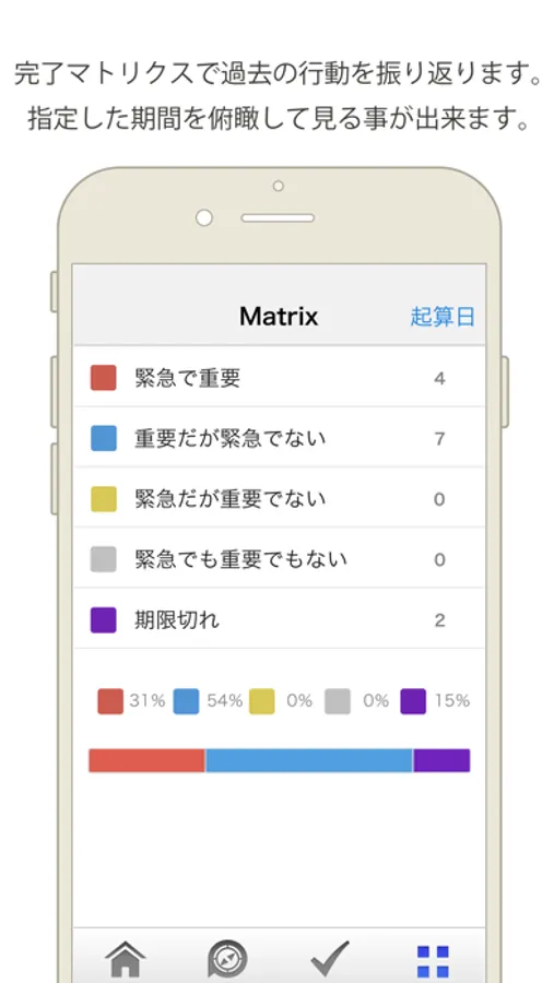 完了マトリクスで過去の行動を振り返ります。指定した期間の記録を俯瞰出来ます。過去の完了タスクはライフログとなり蓄積されていきます。バランスを見ながら予定を管理し将来の再構築をサポートします。青色タスク(重要だが緊急でない)の完了20%くらいがバランスの良い人生設計の目安です。
