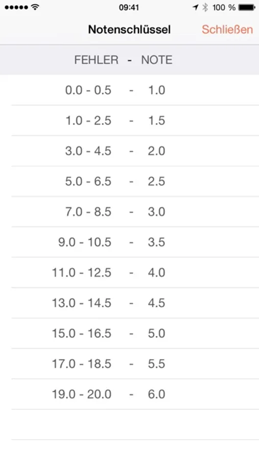 Berechne mit folgender Formel -|1+5*(Fehlerzahl gesamt)/(Fehlerzahl, bei der es eine 6 gibt)|- den Notenschlüssel.