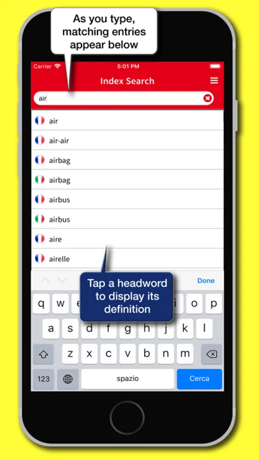 • Index search: displays in alphabetical order the headwords that match the characters typed in the search box