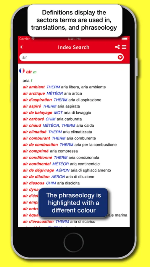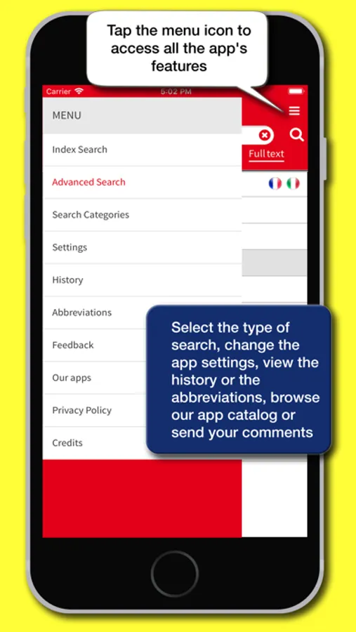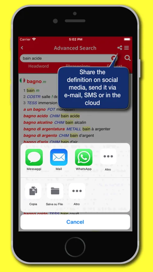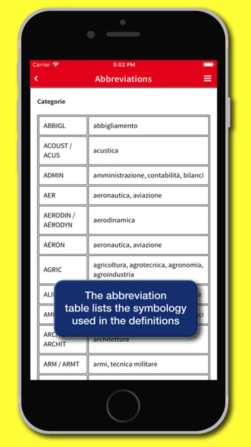 The app's interface has been redesigned to provide a simpler and more intuitive experience. Each definition can be shared using the features available in the device, such as social media, e-mail, SMS, cloud. A main menu that can be activated via an icon available at the top right of the screen enables all the features of the app: