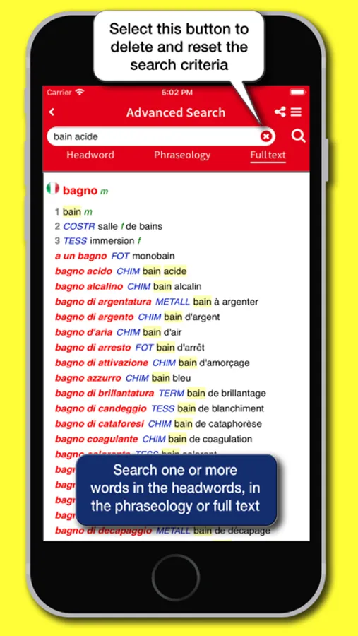 • Advanced search: lets you search for headwords, in the phraseology, and in full text