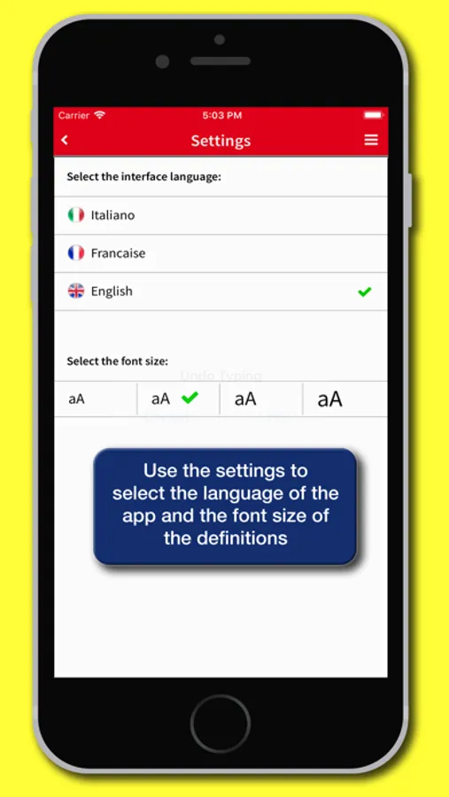 • Settings: allows you to choose the font size of the definitions and the language of the interface