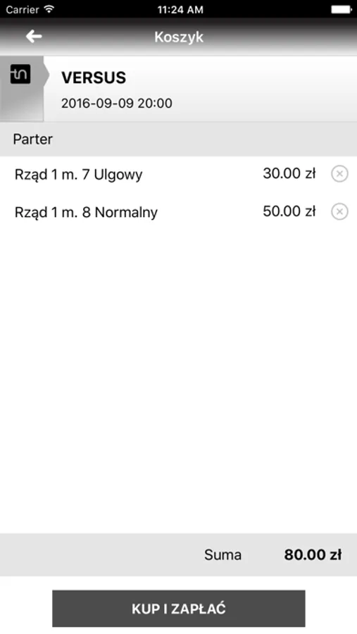 - podgląd zakupionych biletów w aplikacji, QR kod z biletem do okazania obsłudze wydarzenia przy wejściu.