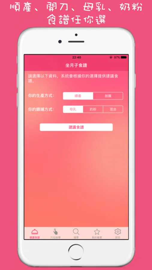 你只需選擇你的生產及餵哺方式,應用程式就會顯示30天建議食譜。