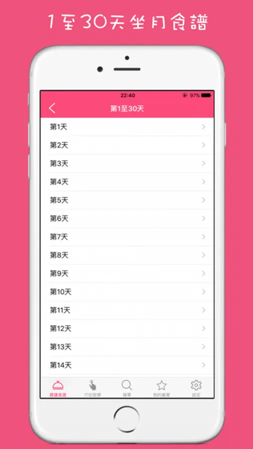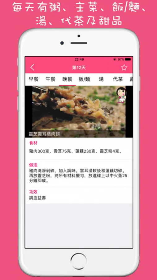 本應用程式的食譜分3個階段性調理,第一階段以清除惡露為主;第二階段以減輕腰酸背痛症狀為主;第三階段就是大補氣血。食譜分為粥、主菜、飯/麵、湯、代茶及甜品,種類繁多。