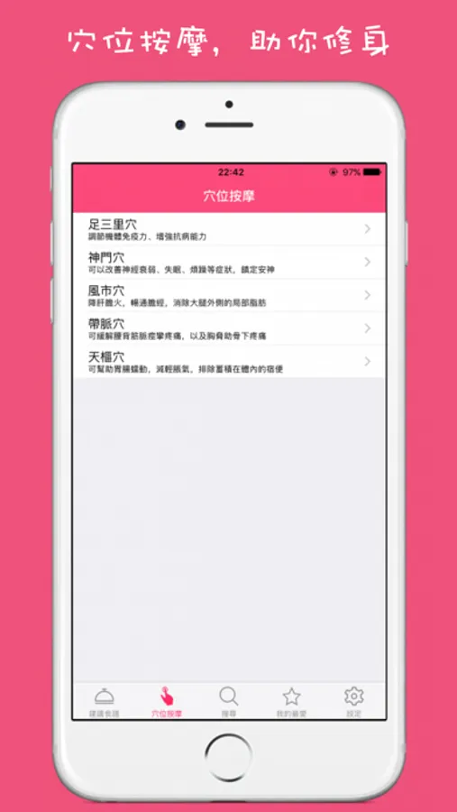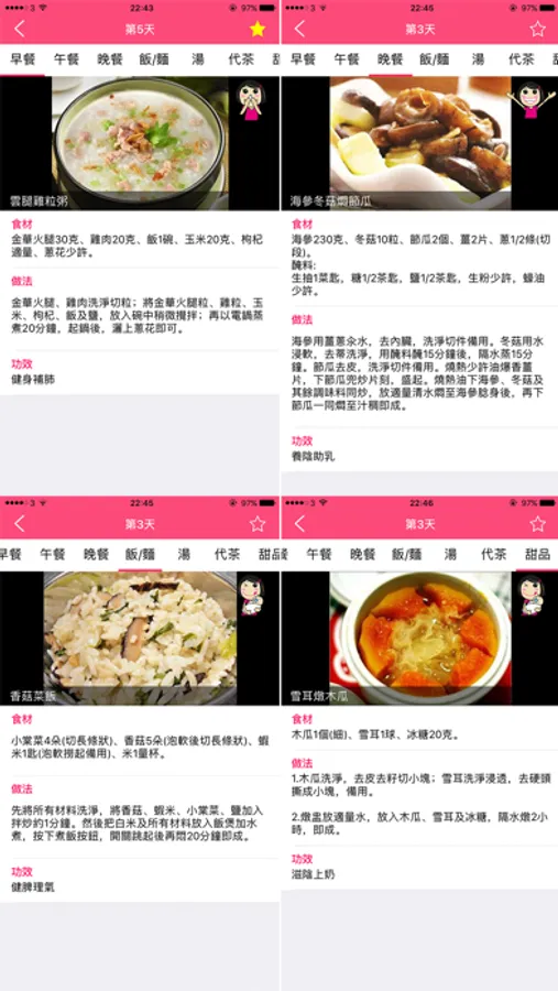 本应用程式的食谱分3个阶段性调理,第一阶段以清除恶露为主;第二阶段以减轻腰酸背痛症状为主;第三阶段就是大补气血。食谱分为粥、主菜、饭/面、汤、代茶及甜品,种类繁多。