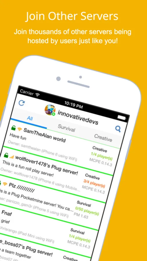 In this version we’ve added an external hosting option. Now you can host any Minecraft games on your network just like you're use to with iOS. This works with Minecraft on Windows 10 PCs, Xbox One, virtual reality platforms, other iOS devices, and other mobile devices - and even Pocketmine servers running on your PC.