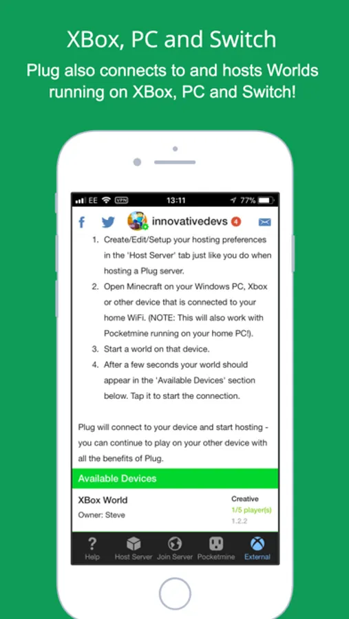 ** Another World first - Now you can also connect Plug to (and host) Minecraft running on other iOS devices, Windows 10 PCs, Xbox One, virtual reality platforms, and other mobile devices. (without anything extra to pay), all with the same Plug commands and features as when hosting on iOS. Just start the world on your other device and then use the App to host that game online!