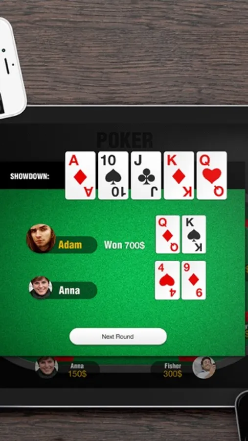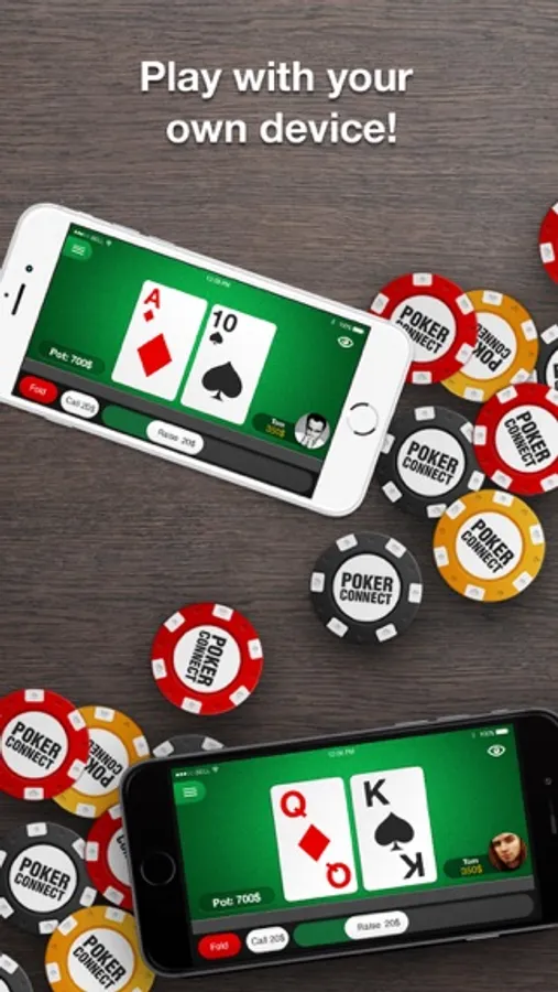 - Gameplay: Use your own device as playing hand to call, raise or fold. Game progress will be shown on the central device.