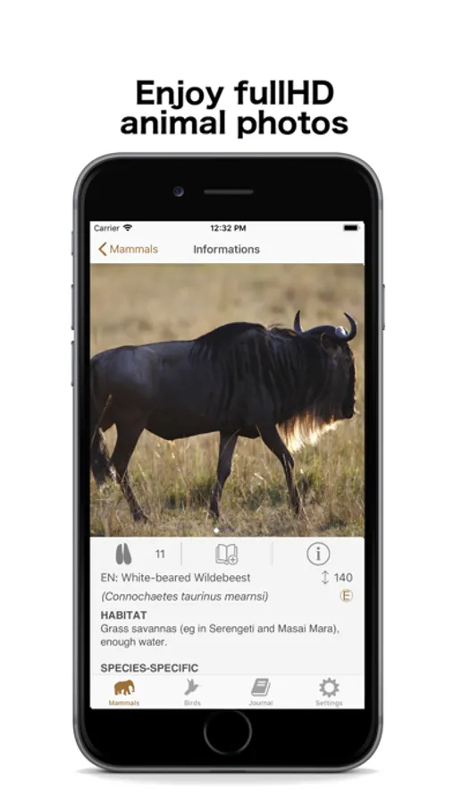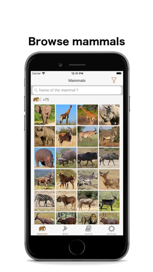 The app lists mammals you might see during the day on safari. The app also lists two nocturnal mammals, as you might occasionally spot them on night safaris: genets and galagos, also known as "bush-babies".