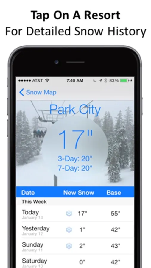 - Review detailed snow history for each resort by clicking on the resort to view the resort-specific page within the app, letting you see many days of snowfall history.