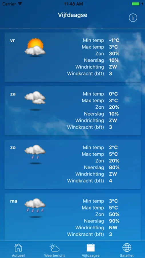 - Een overzicht met gegevens voor de aankomende vijf dagen