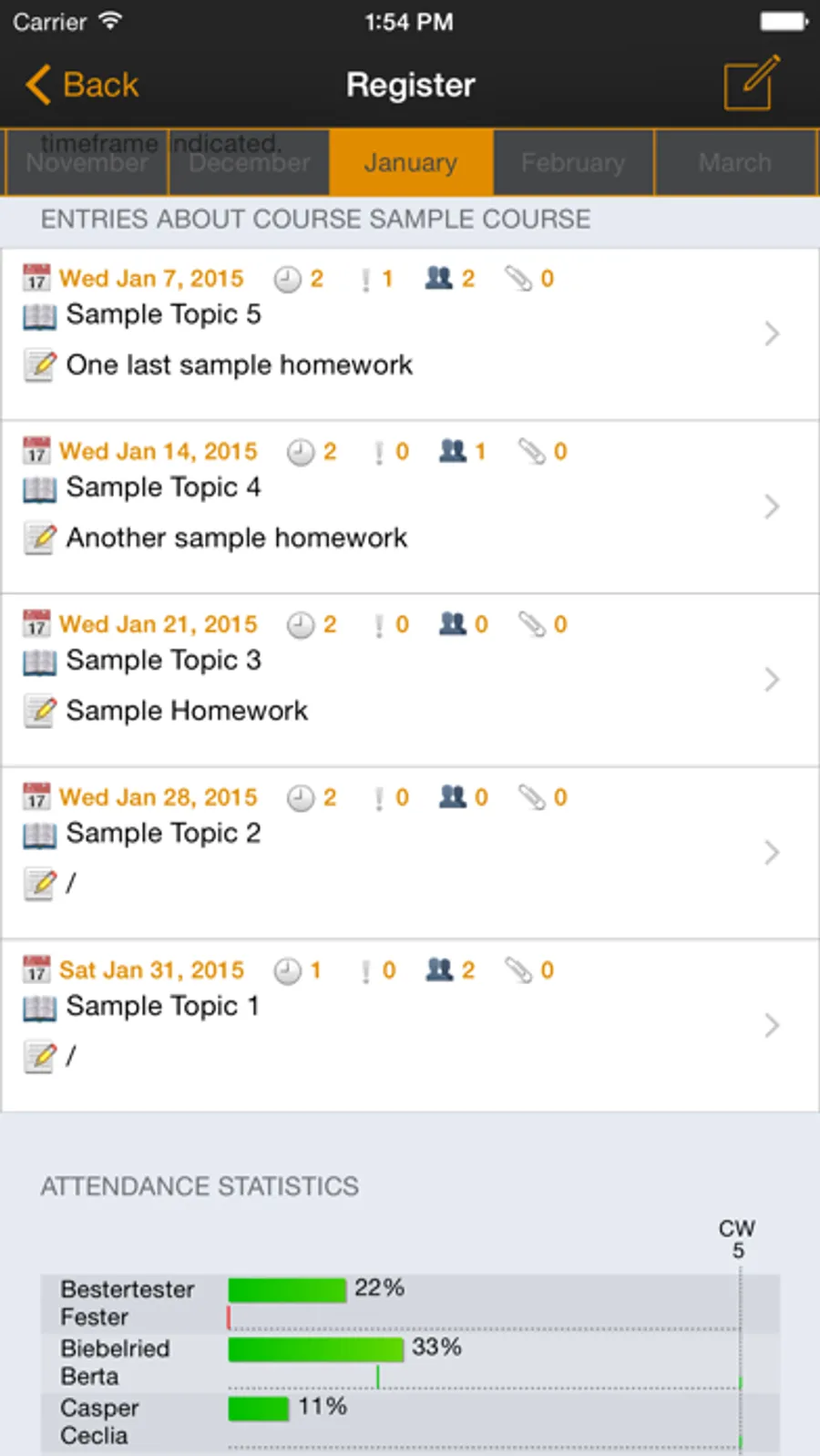 You may also want to record data during lessons in the classroom. Handling this task is one of the special capabilities of the TeacherTool! It knows your class schedule and is very versatile when it comes to making updates: it proposes times of absence to be logged, automatically calculates late arrivals, generates entries into the register and handles lots of other tasks.
