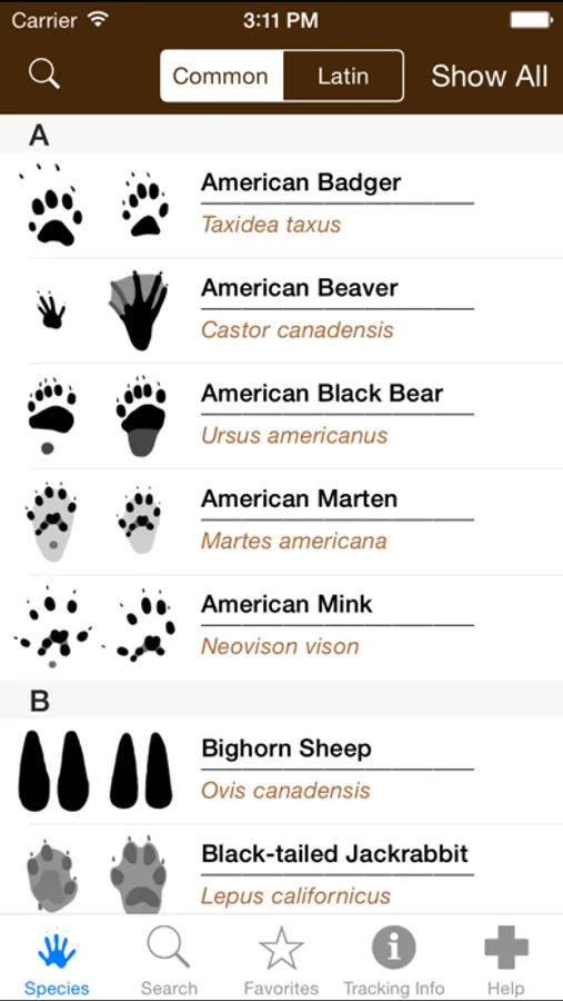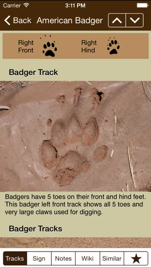 iTrack Wildlife Pro includes 66 species, additional search features, and many more track and sign photos and descriptions for each species.