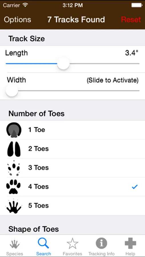 iTrack Wildlife goes far beyond what a traditional field guide can offer with powerful search tools that make track identification easier than ever before. Simply select basic characteristics of a track you want to identify and you will quickly narrow down your search to just a few similar tracks. Then, browse through the photos until you find your track.